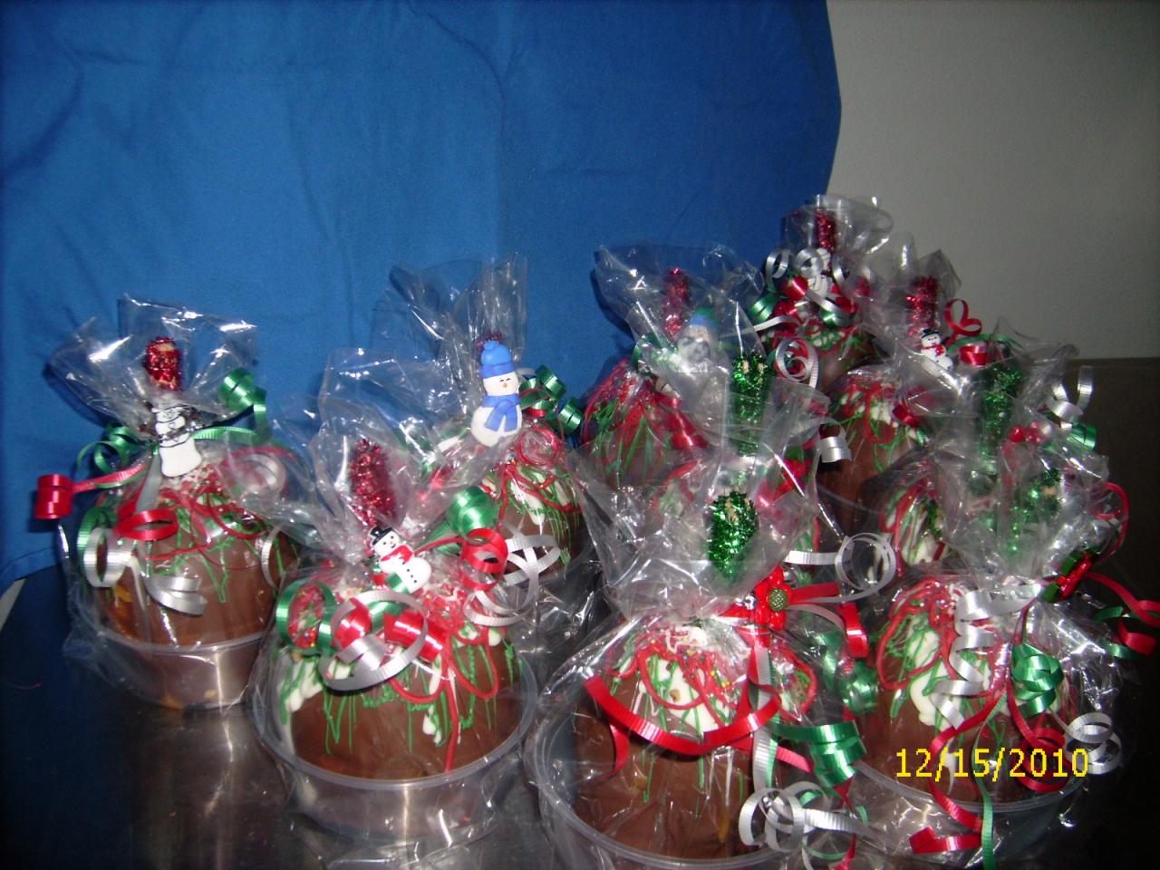 How does an arrangement of chocolate covered strawberries, drizzled with chocolate and possibly covered in chopped pecans sound? Not interested in fruit? What about an assortment of specially decorated sugar cookies? Need something richer? Decorated brownies? Need a special message applied to the confection, or the presentation of a special object? There is a multitude of things Happy can do to help you get your message accross.