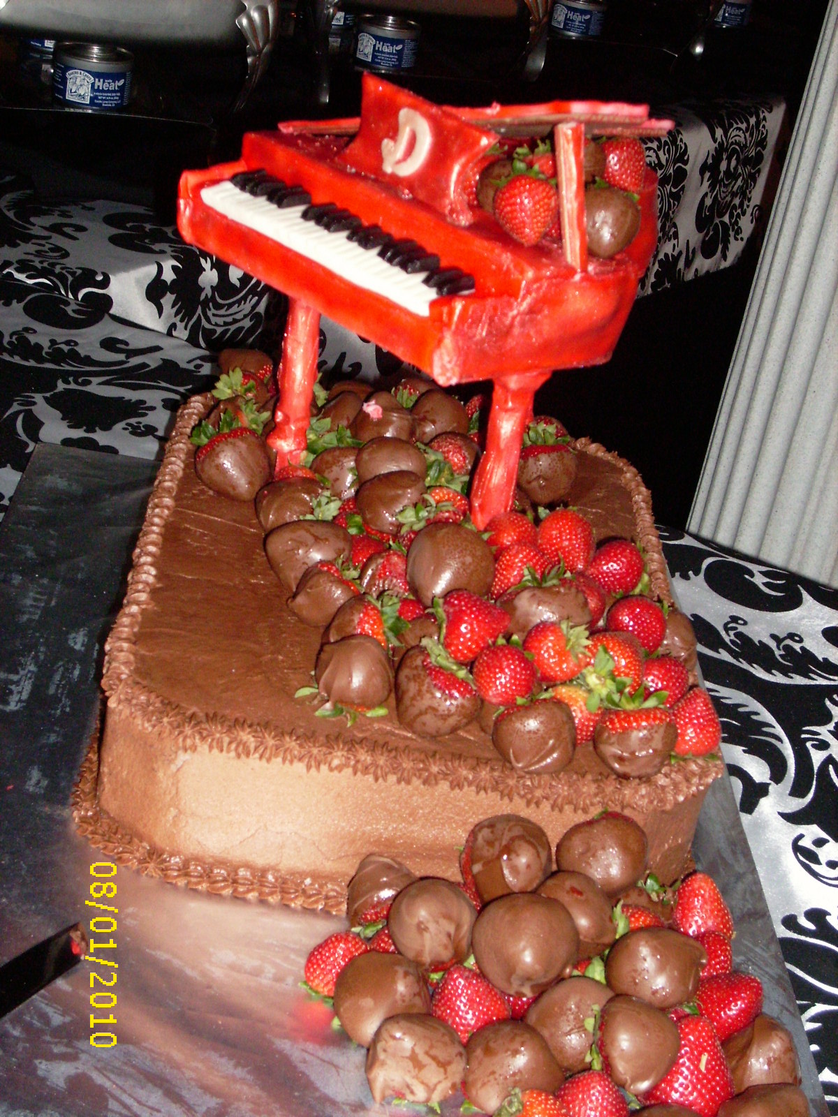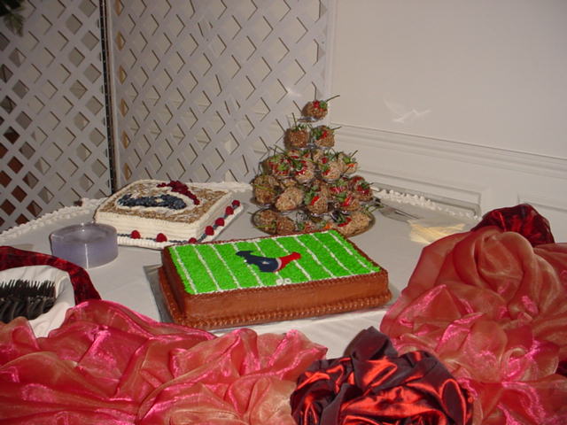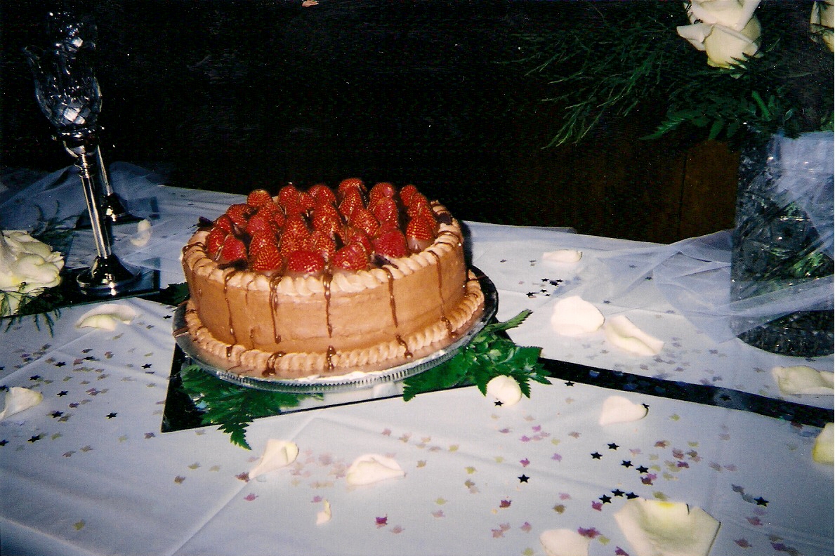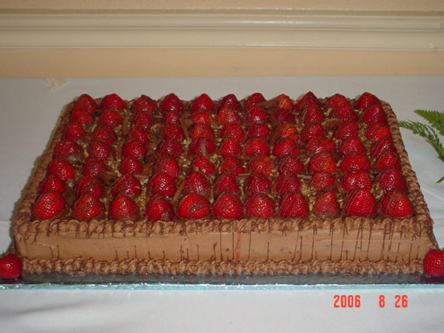 You will see that we refer to Happy's Signature Cake in several of the picture descriptions. What that means is that this is the cake that is requested of her the most. It is her own special blend of Devil's Food Cake with Chocolate Fudge Icing. It is trimmed in cut strawberries dipped in chocolate. Happy also adds ground pecans, chocolate shavings and drizzled chocolate. Yes it is a beautiful and delicious cake. This cake can be used for any number of occasions.